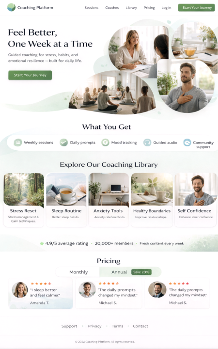 A platform for coaches, studios, and trainers: live streams, video courses, appointment booking, payments, client area, and AI chat. Designed for individual coaching, group programs, and recurring memberships.